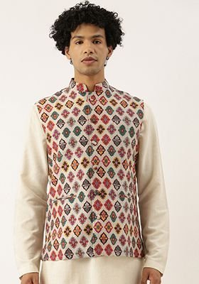 Designed to suit all body types, the Beige Printed Chanderi Nehru Jacket For Men blends tradition with modern aesthetics.
