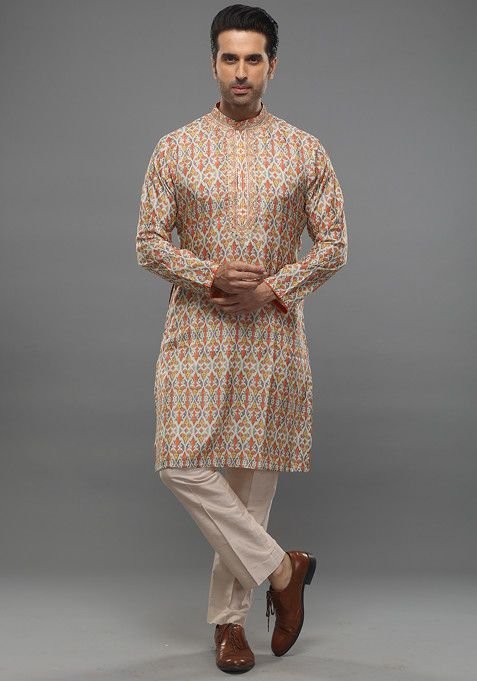Designed to suit all body types, the Beige Printed Kurta Set For Men blends tradition with modern aesthetics.