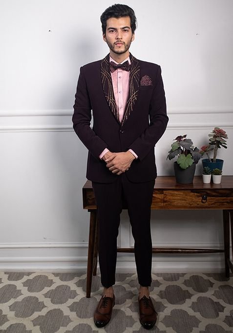 Pair this Berry Wine Embroidered Tuxedo Set For Men with matching accessories for a complete, graceful look.