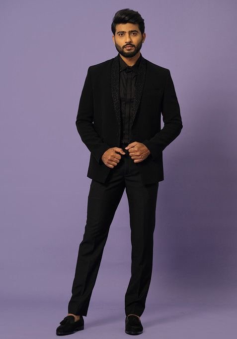 Designed to suit all body types, the Black Cutdana Embroidered Blazer Set For Men blends tradition with modern aesthetics.