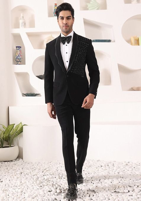 Black Cutdana Embroidered Tuxedo For Men