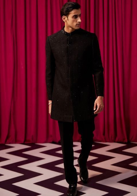 Pair this Black Embellished Formal Sherwani Set For Men with matching accessories for a complete, graceful look.
