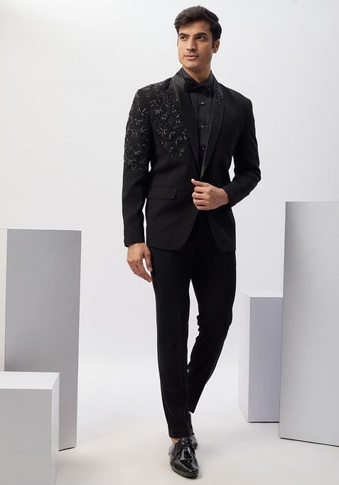 Pair this Black Hand Embroidered Rayon Tuxedo For Men with matching accessories for a complete, graceful look.
