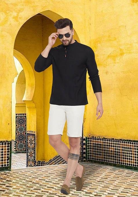 Experience timeless elegance with our Black Solid Art Silk Kurta For Men, crafted to add a royal touch to your wardrobe.