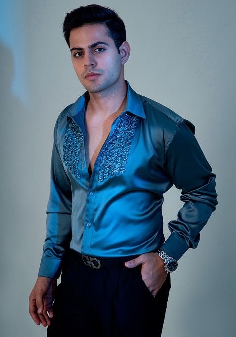 Experience timeless elegance with our Bluish Grey Vintage Satin Shirt For Men, crafted to add a royal touch to your wardrobe.