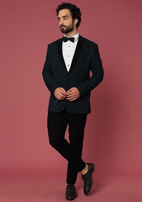 Experience timeless elegance with our Bottle Green Satin Tuxedo For Men, crafted to add a royal touch to your wardrobe.