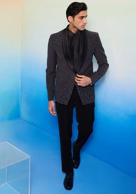 Pair this Charcoal Grey Embroidered Neptune Tuxedo Set For Men with matching accessories for a complete, graceful look.