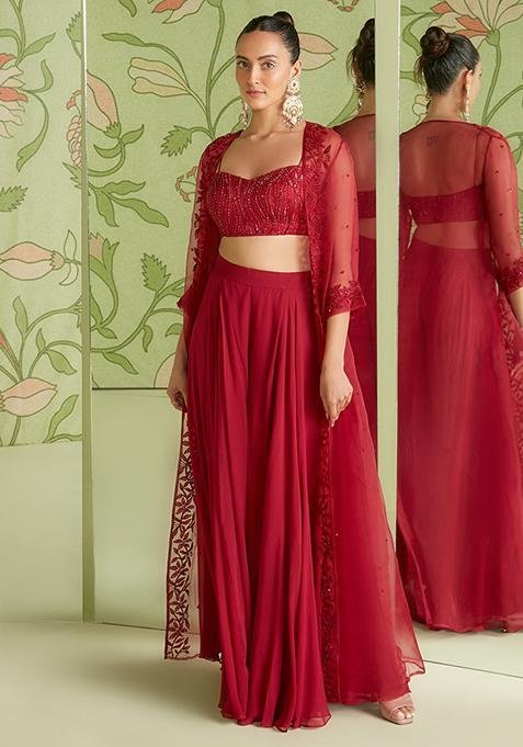 Pair this Cherry Red 3D Embroidered Jacket Set with matching accessories for a complete, graceful look.