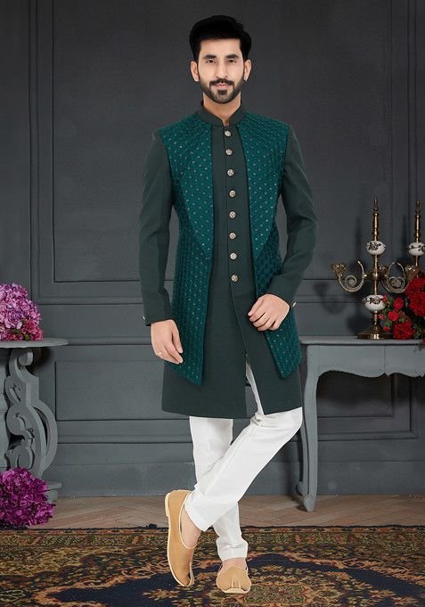 This Dark Green Embroidered Indo Western Jacket And Kurta Set For Men is made from premium fabrics, ensuring comfort while keeping you stylish.