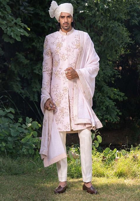 Designed to suit all body types, the Dull Pink Adda Work Sherwani Set For Men blends tradition with modern aesthetics.