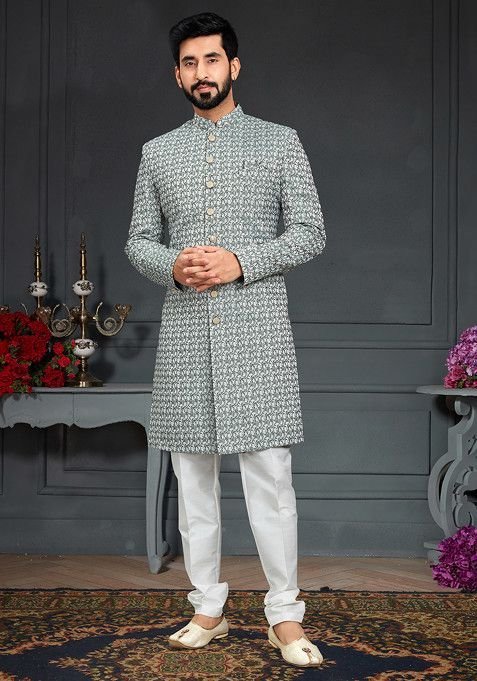 Dusty Green Embroidered Jacquard Indo Western Sherwani Set For Men