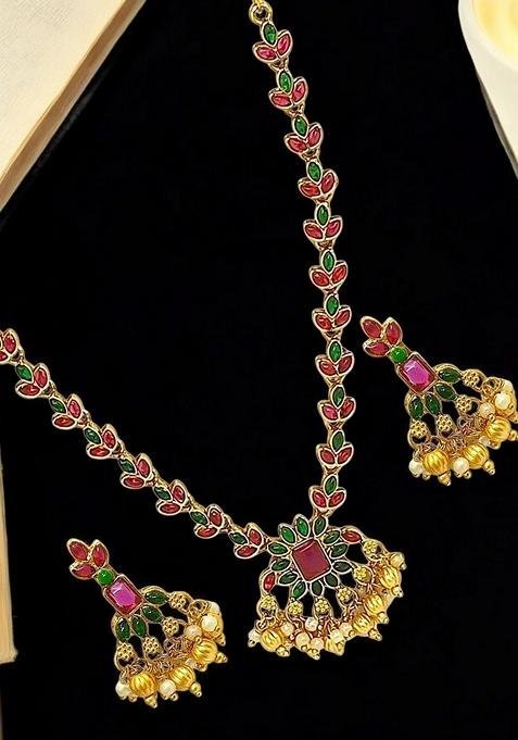 Experience timeless elegance with our Gold Floral Design Necklace Set, crafted to add a royal touch to your wardrobe.