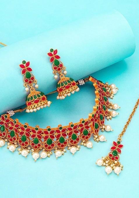 Designed to suit all body types, the Gold Plated Red And Green Stone Studded And White Beaded Temple Jewellery Set blends tradition with modern aesthetics.