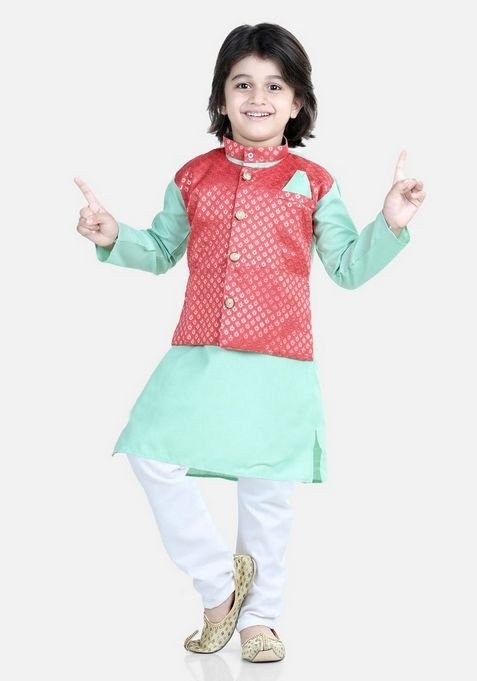 This Green Foil Print Jacket With Kurta And Pyjama (Set of 3) is made from premium fabrics, ensuring comfort while keeping you stylish.