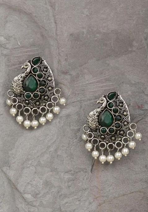 Designed to suit all body types, the Green Stone Oxidised Peacock Earrings For Women blends tradition with modern aesthetics.