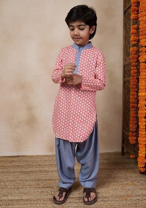 This Grey Printed Cotton Blend Kurta With Pants (Set of 2) is made from premium fabrics, ensuring comfort while keeping you stylish.