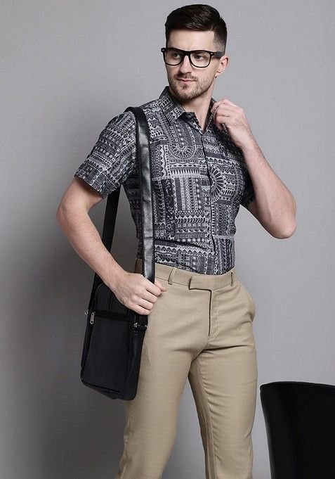 Pair this Grey Printed Cotton Shirt For Men with matching accessories for a complete, graceful look.