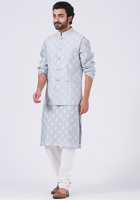 Designed to suit all body types, the Grey Printed Nehru Jacket And Kurta Set For Men blends tradition with modern aesthetics.
