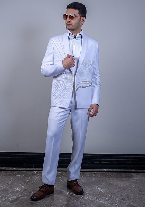 Experience timeless elegance with our Ivory Embroidered Italian Cationic Tuxedo For Men, crafted to add a royal touch to your wardrobe.