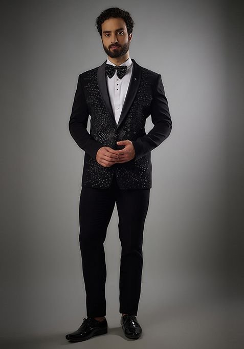 Pair this Jet Black Hand Embroidered Tuxedo Set For Men with matching accessories for a complete, graceful look.