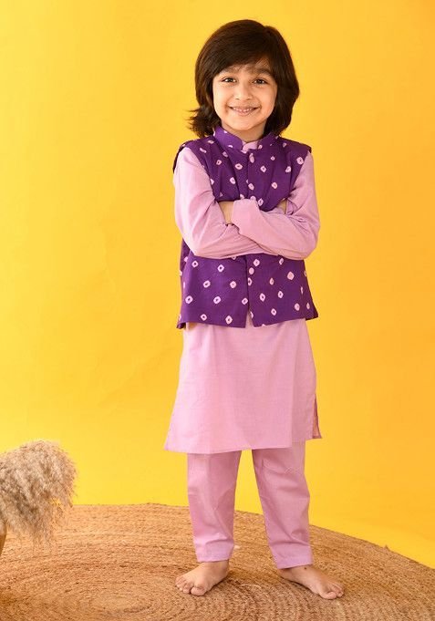 This Lavender Dye Bandhani Print Nehru Jacket With Kurta And Pajama (Set of 3) is made from premium fabrics, ensuring comfort while keeping you stylish.