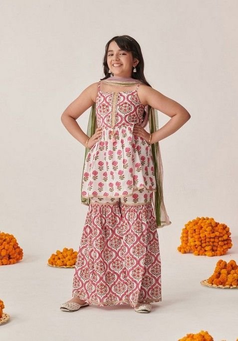 Designed to suit all body types, the Magenta Floral Print Kurta With Sharara And Dupatta (Set of 3) blends tradition with modern aesthetics.