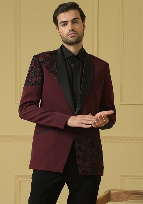 Designed to suit all body types, the Maroon Bead Embroidered Blazer Set For Men blends tradition with modern aesthetics.