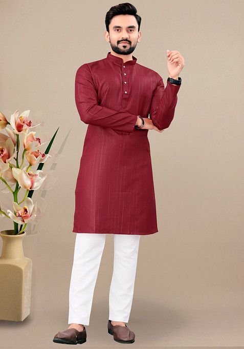 This Maroon Embroidered Cotton Blend Kurta Set For Men is made from premium fabrics, ensuring comfort while keeping you stylish.