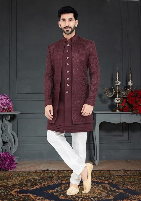 This Maroon Embroidered Indo Western Jacket And Kurta Set For Men is made from premium fabrics, ensuring comfort while keeping you stylish.
