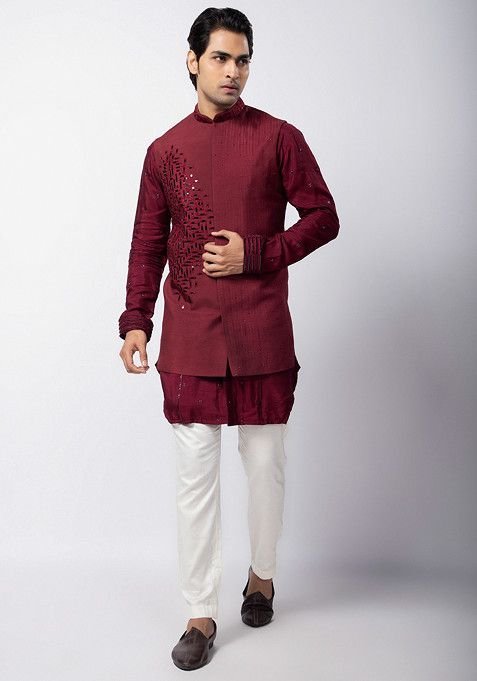 This Maroon Embroidered Silk Nehru Jacket For Men is made from premium fabrics, ensuring comfort while keeping you stylish.