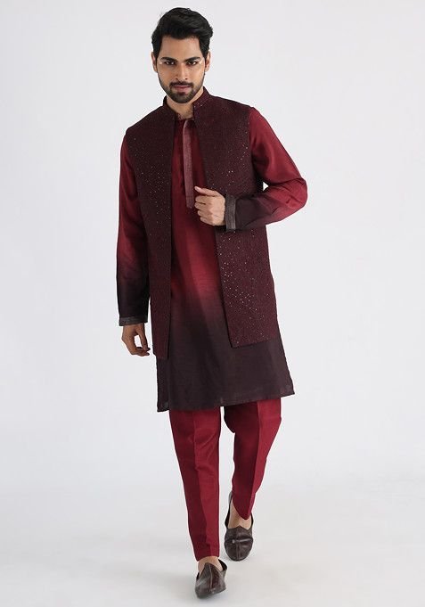 Perfect for weddings, parties, and festive occasions, this piece enhances your cultural charm. Pair this Maroon Hand Embroidered Silk Nehru Jacket Set For Men with matching accessories for a complete, graceful look. Experience timeless elegance with our Maroon Hand Embroidered Silk Nehru Jacket Set For Men, crafted to add a royal touch to your wardrobe. Designed to suit all body types, the Maroon Hand Embroidered Silk Nehru Jacket Set For Men blends tradition with modern aesthetics. This Maroon Hand Embroidered Silk Nehru Jacket Set For Men is made from premium fabrics, ensuring comfort while keeping you stylish.