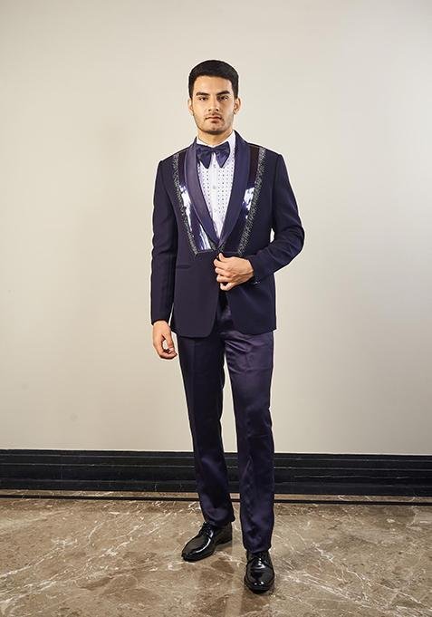 Experience timeless elegance with our Navy Blue Embroidered Italian Cationic Tuxedo For Men, crafted to add a royal touch to your wardrobe.