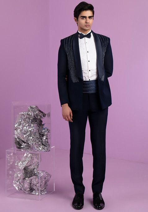Pair this Navy Blue Hand Embroidered Cosmic Tuxedo Set For Men with matching accessories for a complete, graceful look.