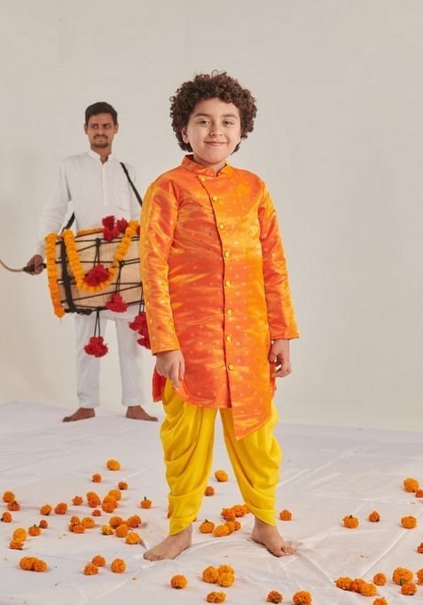 Experience timeless elegance with our Orange Foil Print Kurta With Dhoti Pants (Set of 2), crafted to add a royal touch to your wardrobe.
