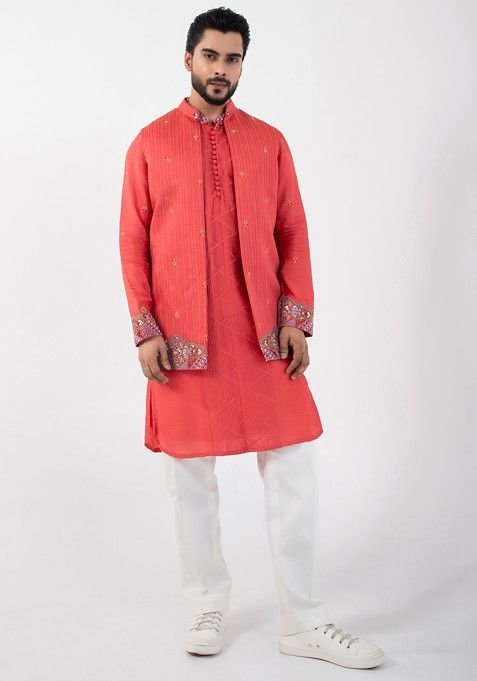 This Orange Hand Embroidered Linen Satin Nehru Jacket Set For Men is made from premium fabrics, ensuring comfort while keeping you stylish.