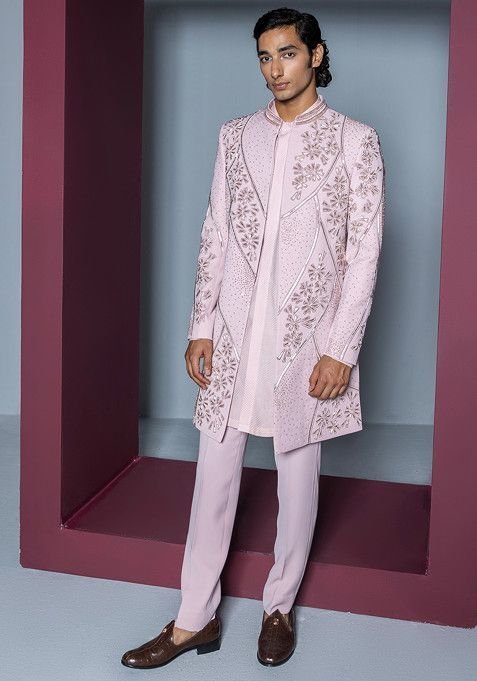 Designed to suit all body types, the Pale Pink Embroidered Mehroom Sherwani Set For Men blends tradition with modern aesthetics.