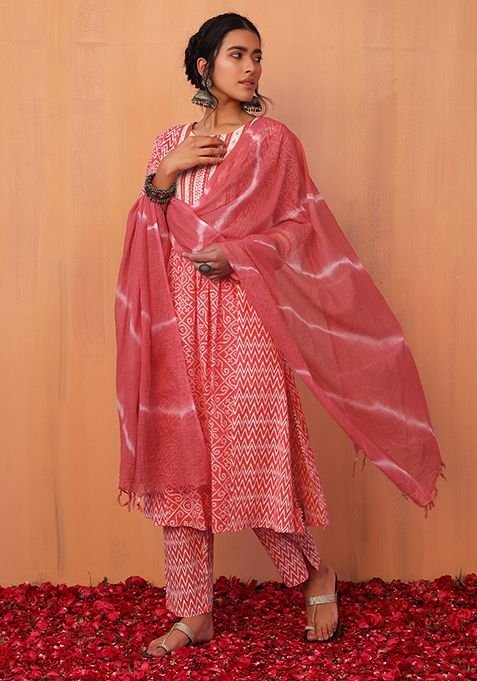 Designed to suit all body types, the Peach Bandhani Print A-Line Kurta With Pants And Dupatta (Set of 3) blends tradition with modern aesthetics.