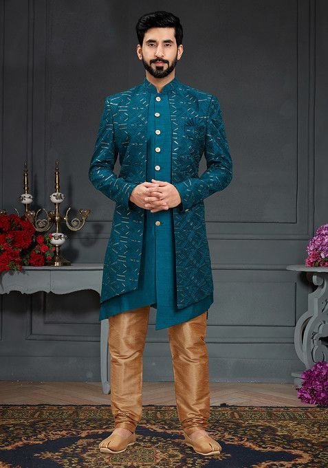 This Peacock Blue Embroidered Indo Western Jacket And Kurta Set For Men is made from premium fabrics, ensuring comfort while keeping you stylish.