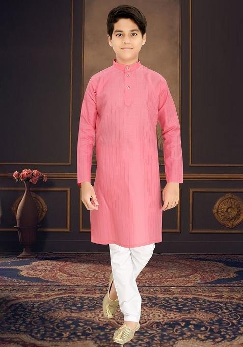 Designed to suit all body types, the Pink Cotton Blend Kurta Set For Boys blends tradition with modern aesthetics.
