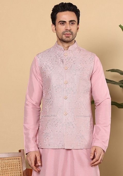 Designed to suit all body types, the Pink Embellished Viscose Dupion Silk Nehru Jacket blends tradition with modern aesthetics.
