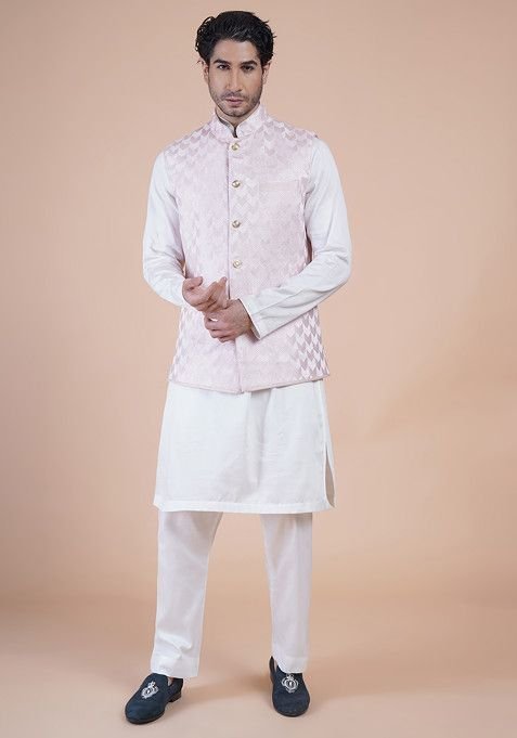 Pair this Pink Embroidered Raw Silk Bundi Jacket For Men with matching accessories for a complete, graceful look.