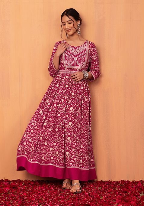 Designed to suit all body types, the Pink Floral Print Anarkali Kurta With Belt (Set of 2) blends tradition with modern aesthetics.