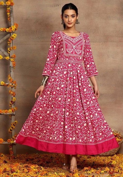 Designed to suit all body types, the Pink Floral Print Embroidered Anarkali Kurta With Belt (Set of 2) blends tradition with modern aesthetics.