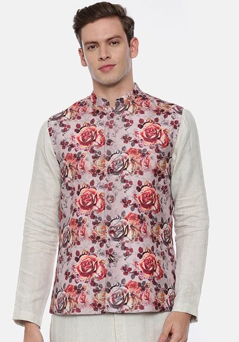 This Pink Floral Print Linen Nehru Jacket For Men is made from premium fabrics, ensuring comfort while keeping you stylish.
