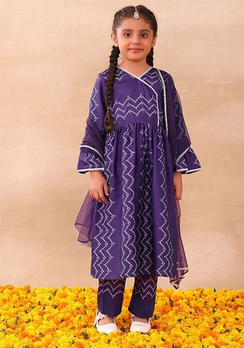 Designed to suit all body types, the Purple Chevron Print Kurta With Pants And Dupatta (Set of 3) blends tradition with modern aesthetics.