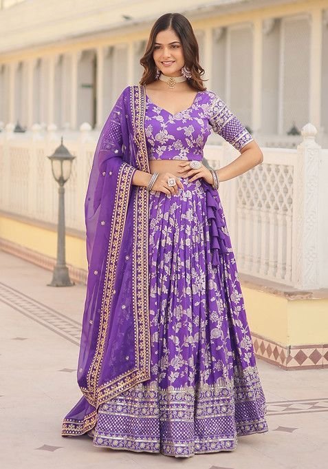Designed to suit all body types, the Purple Embroidered Viscose Jacquard Lehenga Set blends tradition with modern aesthetics.