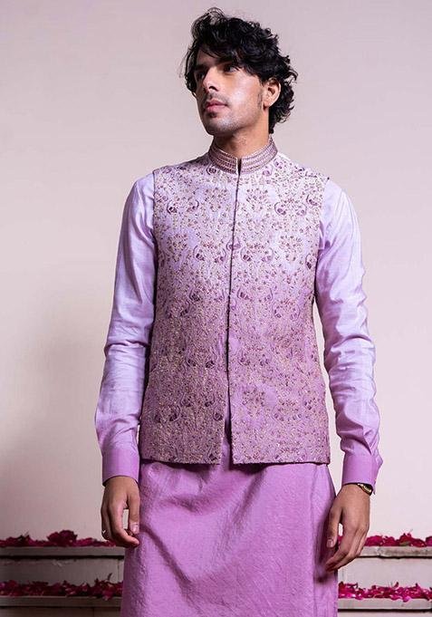 Pair this Purple Ombre Embroidered Bundi Jacket For Men with matching accessories for a complete, graceful look.