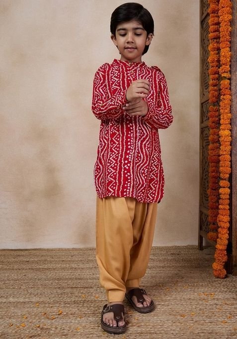 Designed to suit all body types, the Red Printed Cotton Blend Kurta With Pants (Set of 2) blends tradition with modern aesthetics.