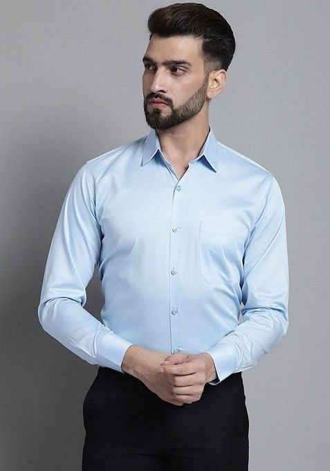 Experience timeless elegance with our Sky Blue Cotton Blend Shirt For Men, crafted to add a royal touch to your wardrobe.