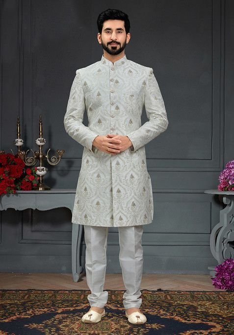 Designed to suit all body types, the White Embroidered Jacquard Indo Western Sherwani Set For Men blends tradition with modern aesthetics.